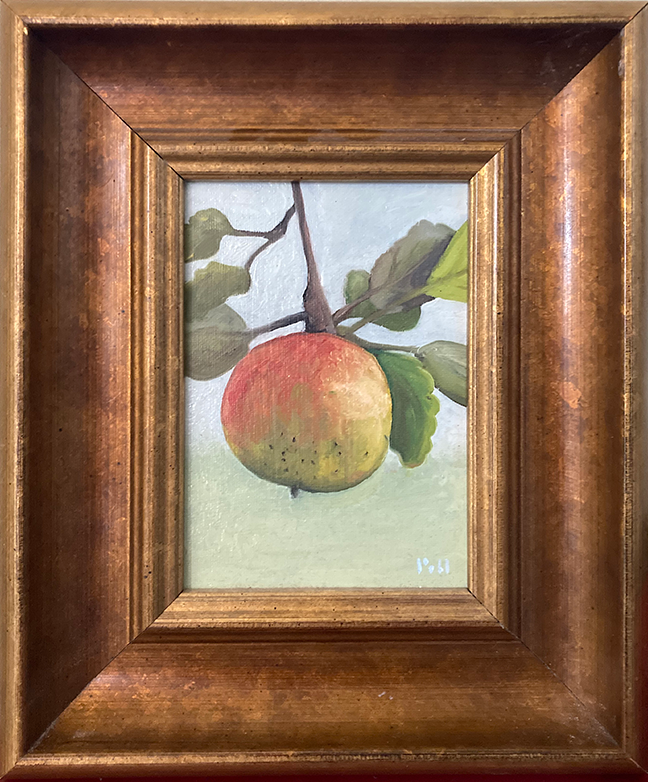 Apple In Gold Frame (NL-267) oil paint on canvas board; 7 x 7; frame 10 x 12