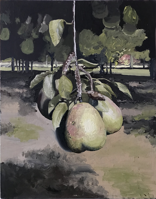 Dangling Pears (NL-249) oil paint on wood panel; 8 x 10
