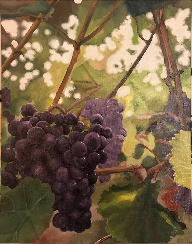Grapes and Sunny Leaves (NL-259) oil paint on wood panel; 9 x 12; frame 11 x 14