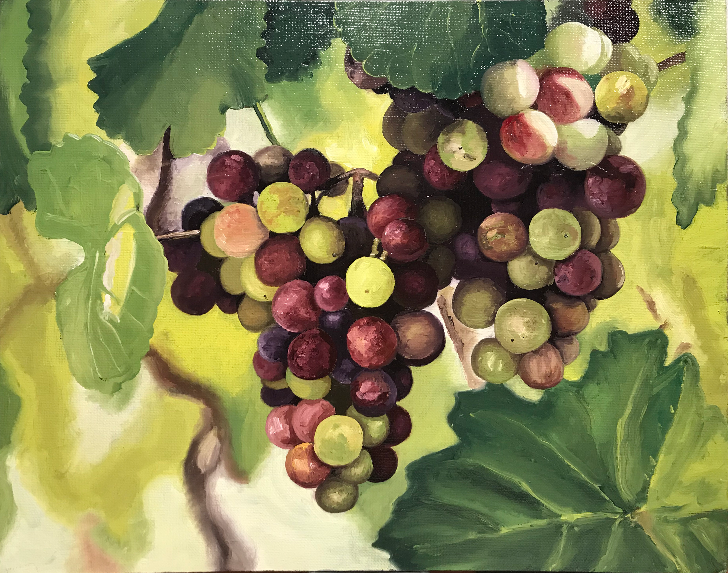 Two Bunches of Grapes (NL-255) oil paint on canvas board; 18 x 14